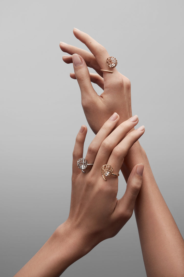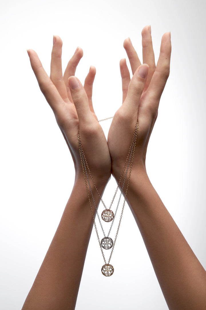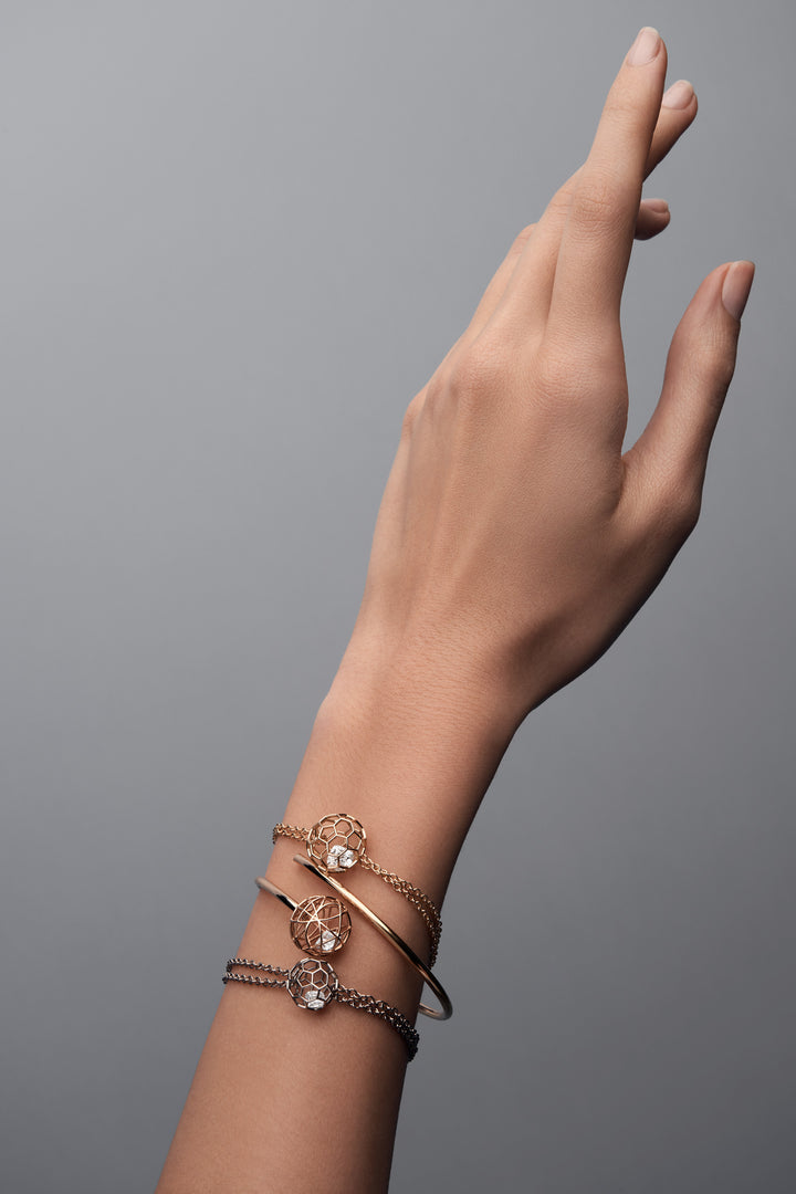The gems, protected by a finely crafted nest, are free to move and sparkle, to be admired from every angles in complete authenticity and respect. They can be worn in every way imaginable as necklaces, earrings, bracelets